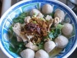 - ขอเส้นหมี่ลูกชิ้นน้ำใสไม่ใส่กระเทียมครับ /kɔ̌ɔ sên mìi lûuk chín náam sǎi mâi sài grà-tiam kŕap/ = I want vermicelli with pork ball in clear soup. Don’t add garlic.