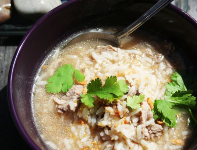 Kâao-dtôm is a popular breakfast dish, a salty porridge-like soup that is cooked with pork(mǔu) and garlic(grà-tiam).