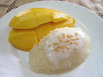 Kâao-nǐaw, “sticky rice” is eaten by hand when served with dishes of northeastern influence, such as grilled chicken(gài yâang) and spicy papaya salad (sôm dtam); however, sticky rice is a crucial ingredient in a favourite Thai dessert, sticky rice and mango(kâao-nǐaw má-mûang).